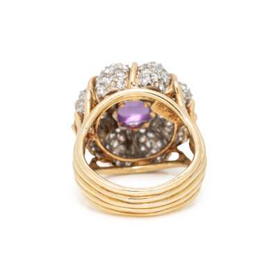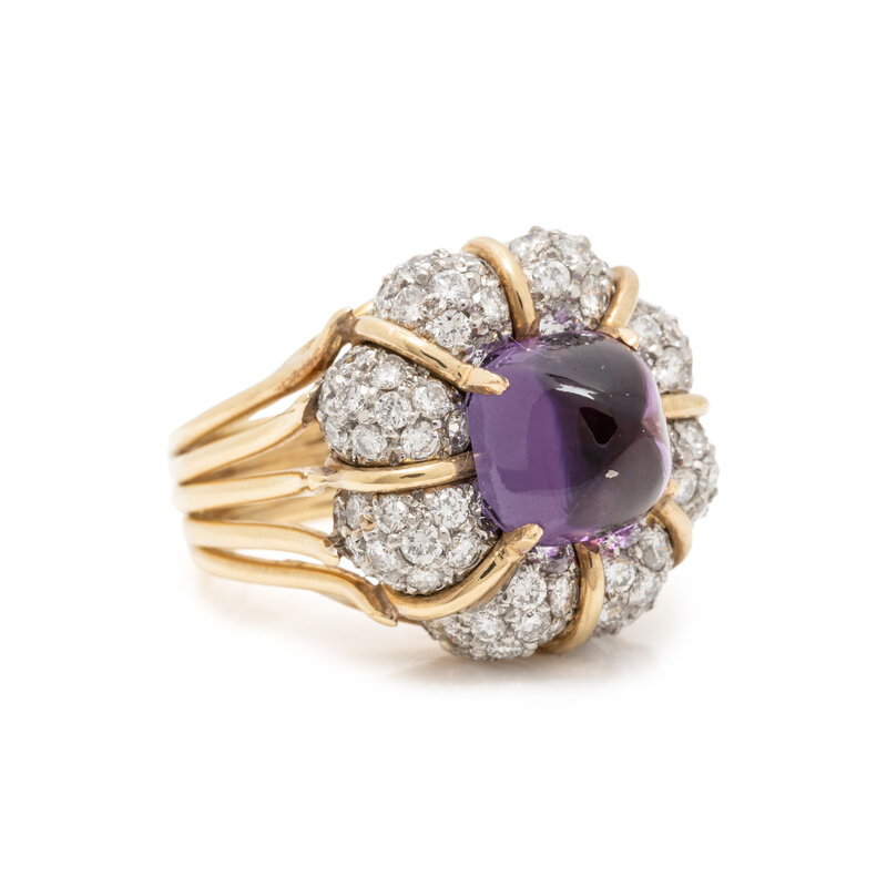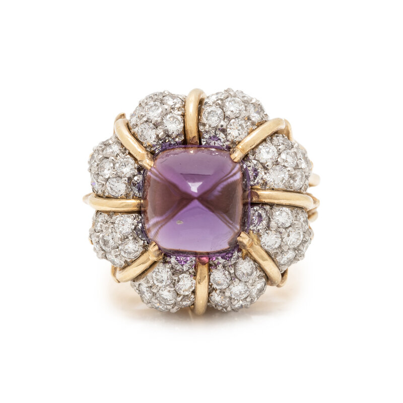 Containing one square sugarloaf amethyst measuring approximately 9.30 x 9.00 x 7.60 mm and round brilliant cut diamonds weighing approximately 2.00 carats total. Mounted in 18 karat yellow gold and platinum. Ring size 6.