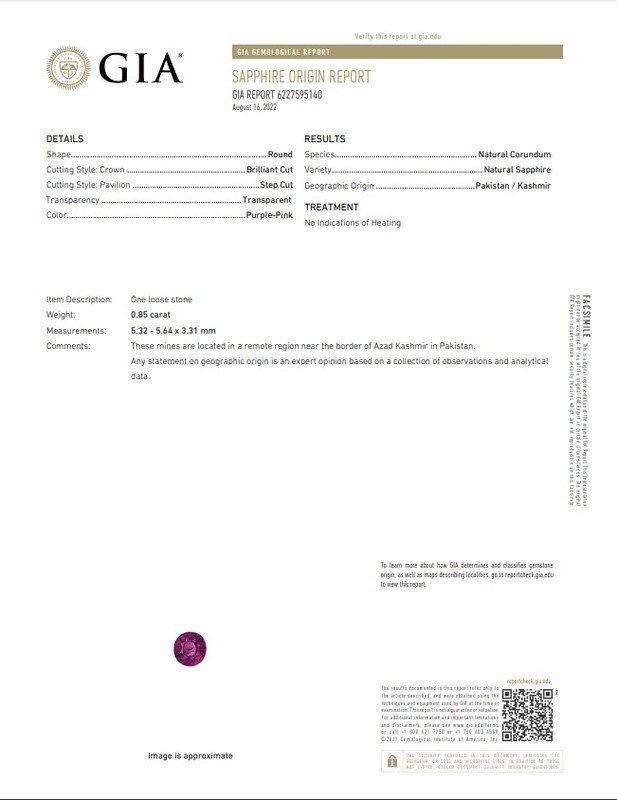 GIA, 2022, Report No. 6227595140, 0.85 carat, Natural Corundum, Sapphire, Purple-Pink color, Pakistan/Kashmir, No Indications of Heating