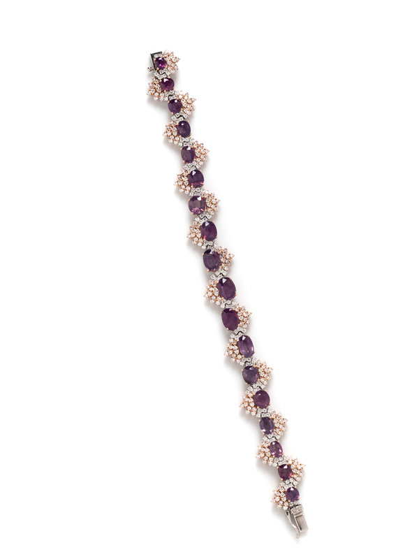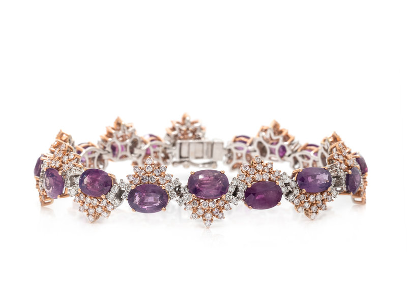 Containing 18 round and oval mixed cut purple sapphires and numerous round brilliant cut diamonds weighing approximately 5.50 carats total. Mounted in rose and white gold. 7 1/4 inches long.