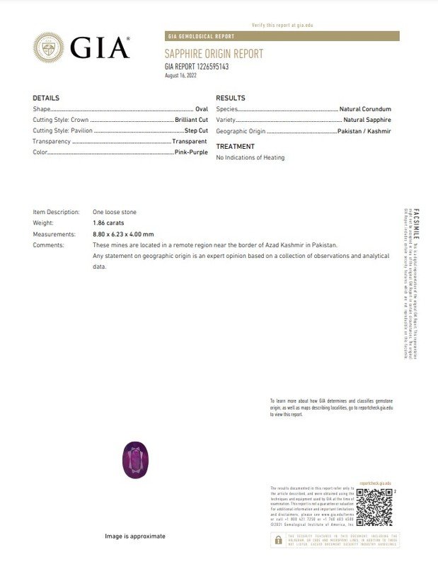 GIA, 2022, Report No. 1226595143, 1.86 carats, Natural Corundum, Sapphire, Pink-Purple color, Pakistan/Kashmir, No Indications of Heating