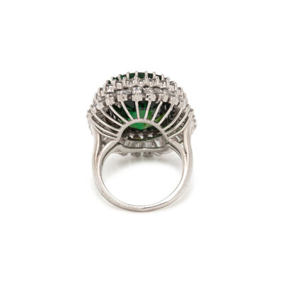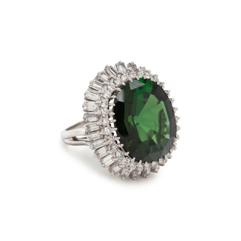 Containing one oval step cut green tourmaline measuring approximately 20.00 x 16.45 x 10.25 mm surrounded by a double halo of round brilliant cut and baguette cut diamonds weighing approximately 3.60 carats total. Mounted in platinum. Ring size 7 1/2.