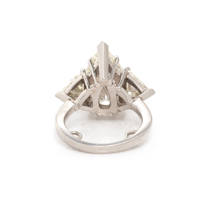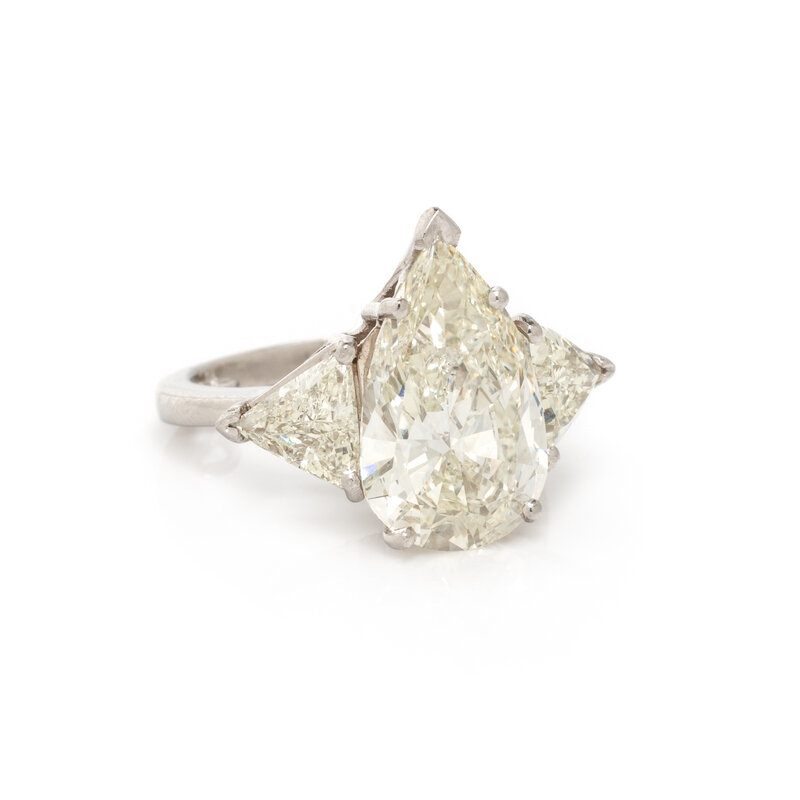 Containing one pear shaped diamond weighing approximately 5.50 carats and two trillion cut diamonds weighing approximately 1.70 carats total. Mounted in platinum. Ring size 5 1/2.