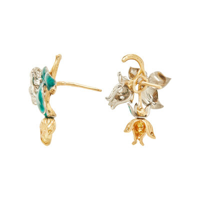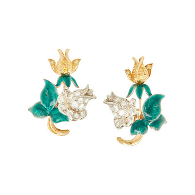 Designed as roses, containing eight single cut yellow diamonds (origin of color not tested) and 24 round brilliant and single cut diamonds, with green enamel leaves. Mounted in yellow and white gold. 1 inch long.