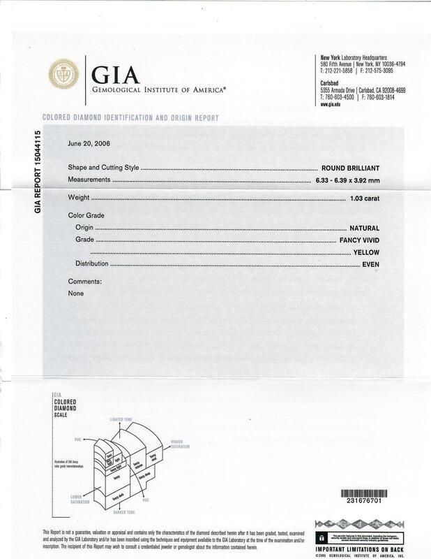 GIA, 2006, Report No. 15044115, 1.03 carats, Fancy Vivid Yellow, Natural color (Please note certificate over 10 years old and updating certificate is recommended)