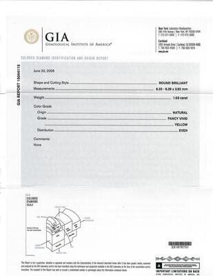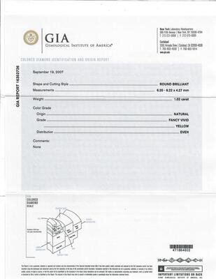 GIA, 2006, Report No. 16352726, 1.02 carats, Fancy Vivid Yellow, Natural color (Please note certificate over 10 years old and updating certificate is recommended)