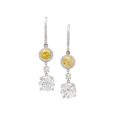 Set with two round brilliant cut fancy vivid yellow diamonds weighing 2.05 carats total, two round brilliant cut diamonds weighing 6.02 carats total, and round brilliant cut diamonds weighing approximately 0.40 carat total. Mounted in 14 karat white gold. 1 1/2 inches long.