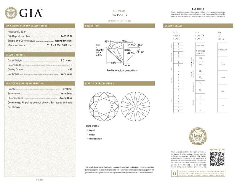 GIA, 2024, Report No. 16355107, 3.01 carats, G color, VS2 clarity, Strong Blue fluorescence