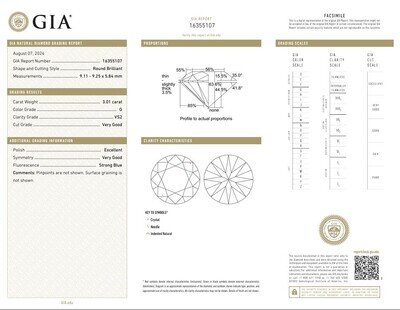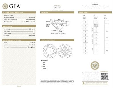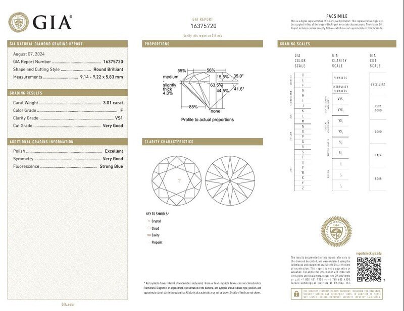 GIA, 2024, Report No. 16375720, 3.01 carats, F color, VS1 clarity, Strong Blue fluorescence