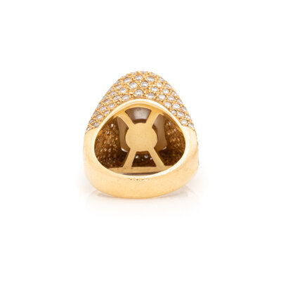 Containing one golden South Sea cultured pearl measuring approximately 15.70 mm and round brilliant cut diamonds weighing approximately 2.35 carats total. Mounted in 18 karat yellow gold. Ring size 6 3/4.