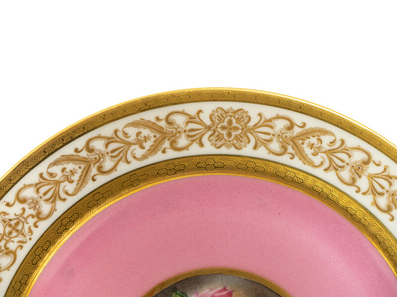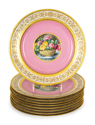 A Set of Eight Charles Ahrenfeldt Limoge Pink-Ground Porcelain Cabinet Plates