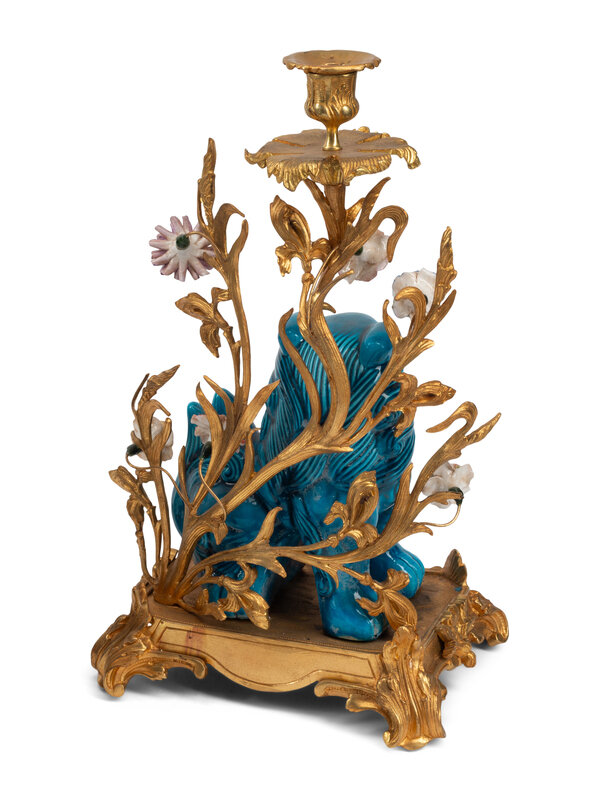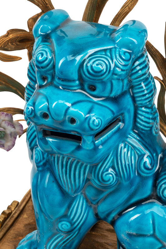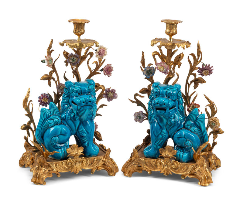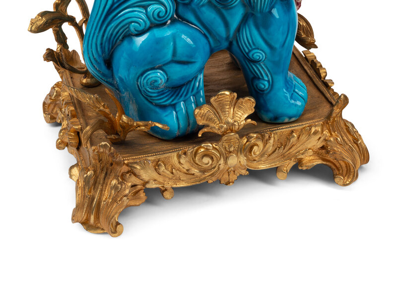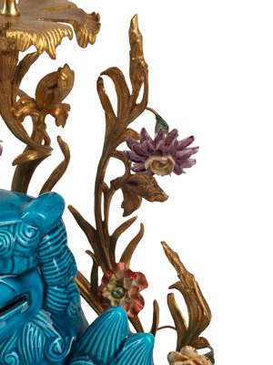 A Pair of French Gilt Bronze Mounted Turquoise Glazed Porcelain Guardian Lion Candelabra