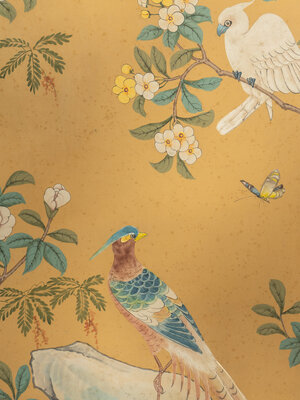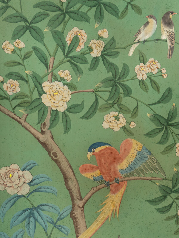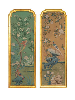 A Pair of Hand-Painted Chinoiserie Wallpaper Panels in Carved Gilt Wood Frames
