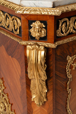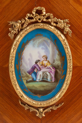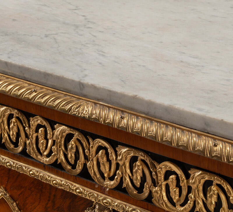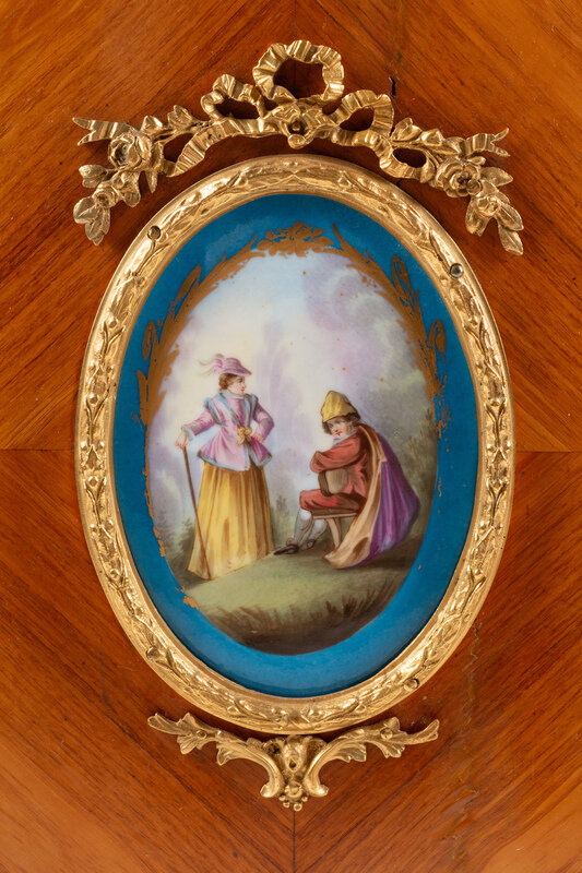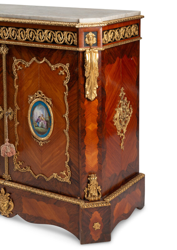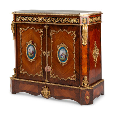 A French Gilt Bronze and Porcelain Plaque-Mounted Kingwood and Tulipwood Marble-Top Cabinet
