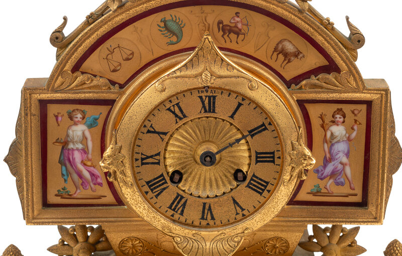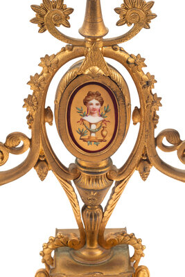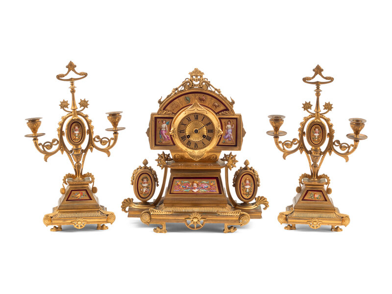 A French Neoclassical Gilt Bronze and Porcelain Plaque-Inset Clock Garniture