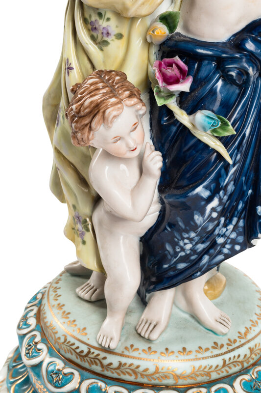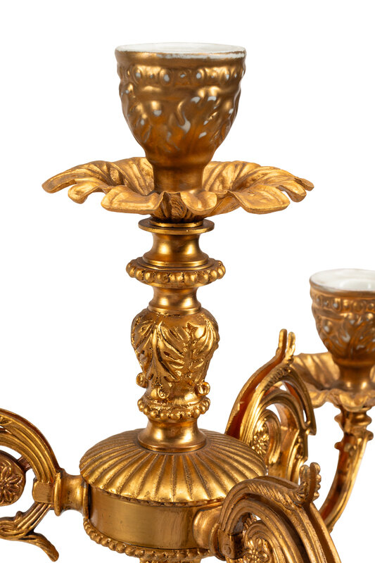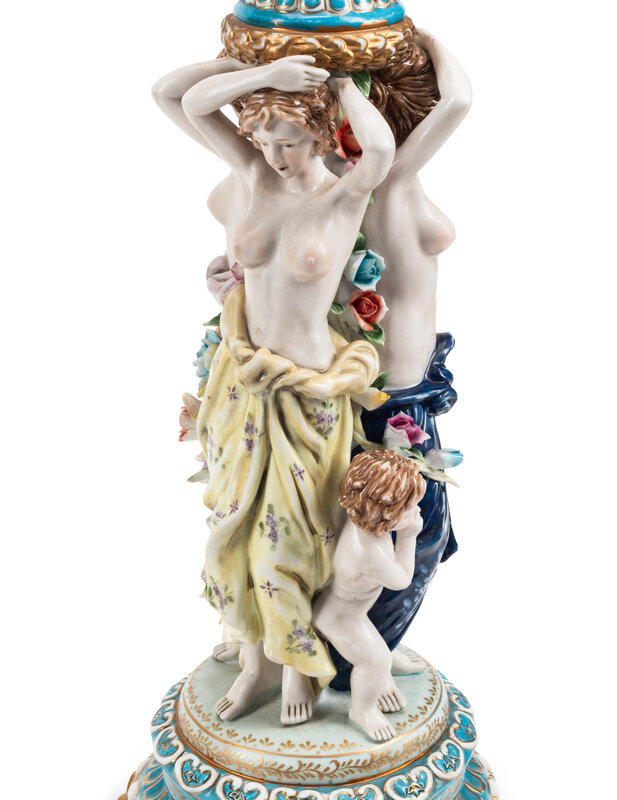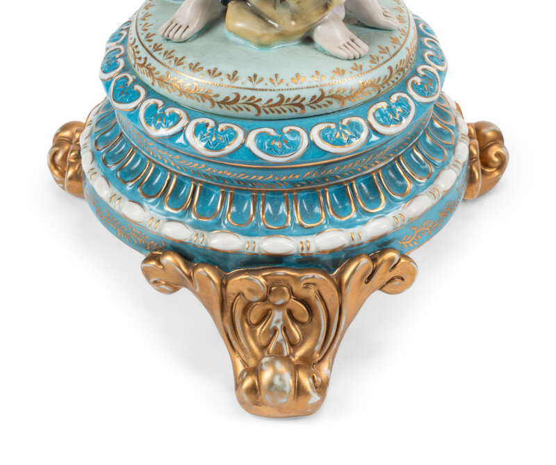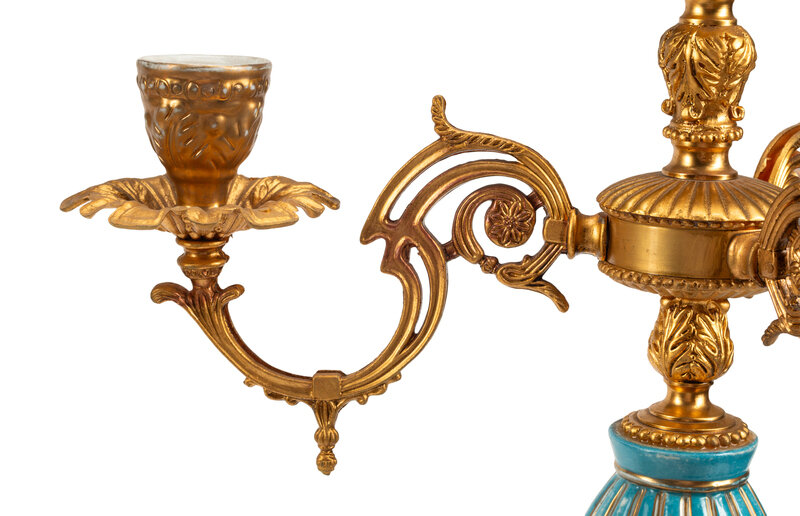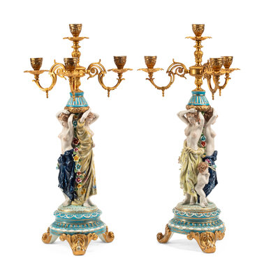 A Pair of Gilt Metal and Porcelain Figural Four-Light Candelabra