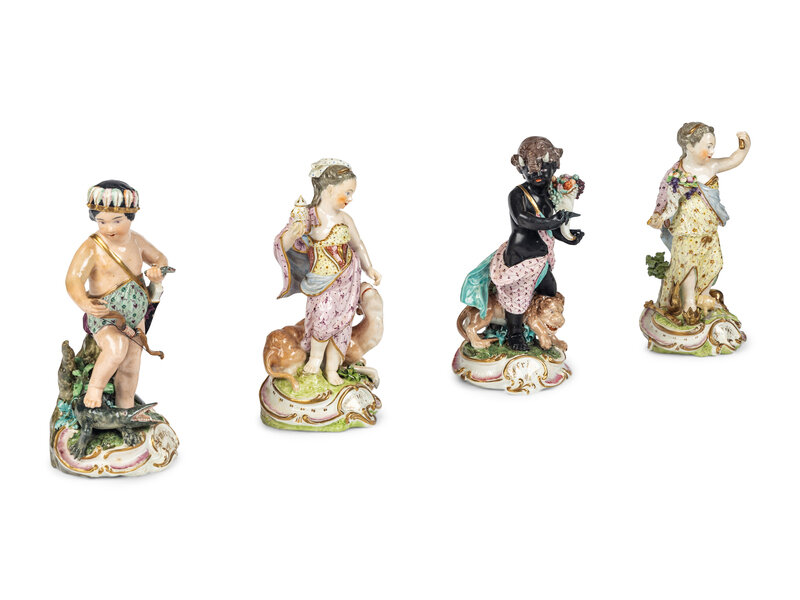 depicting Africa, America, Asia and Europe, each bearing spurious crossed swords marks in underglaze blue to underside.
