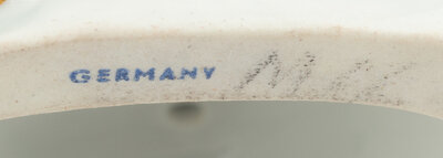 each bearing crossed swords mark in underglaze blue to the back of the base and stamped 'Germany' to the underside; the male figure incised '3' '152V', the female figure incised '3' and further numbered '81' to underside.