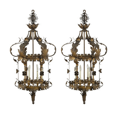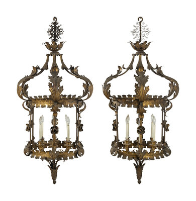 A Pair of Gilt Tôle, Glass and Giltwood Hall Lanterns from the Embassy of Italy, Washington, D.C.
