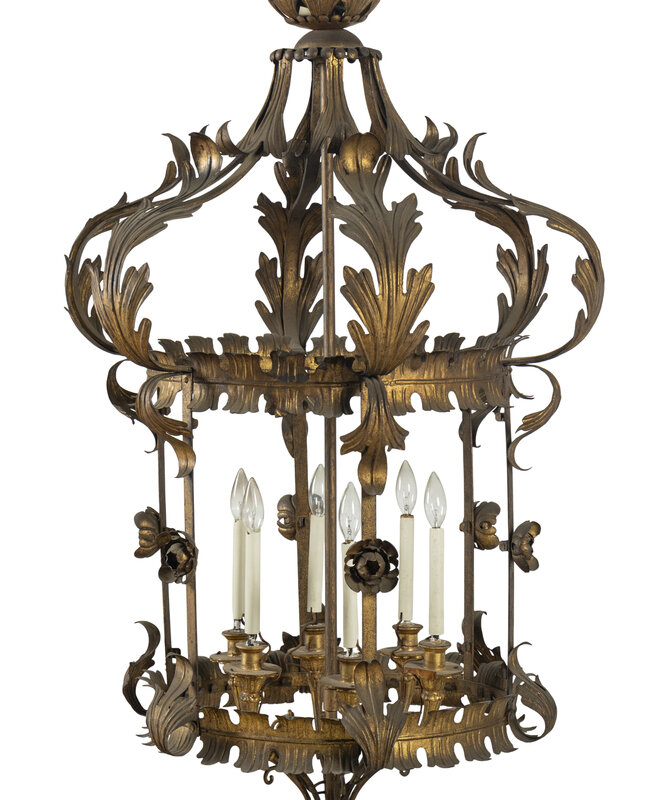 together with a set of twenty-two gilt tole ornamental hooks forming ceiling chains.