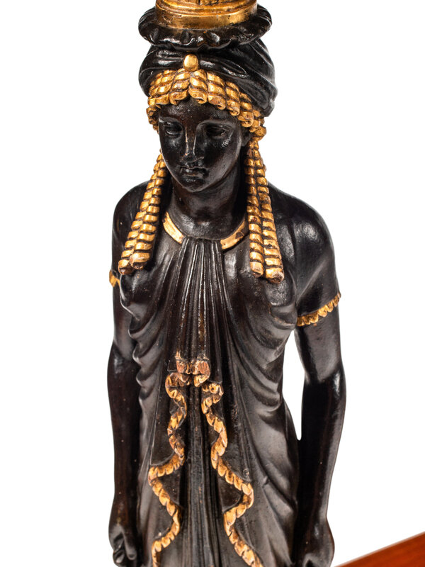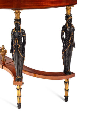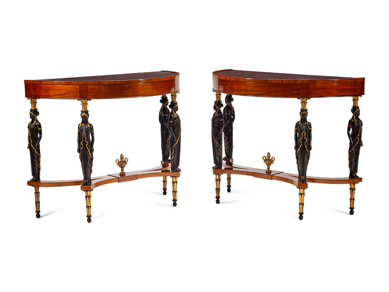 A Pair of Italian Neoclassical Painted and Parcel Gilt Mahogany Marble-Top Console Tables