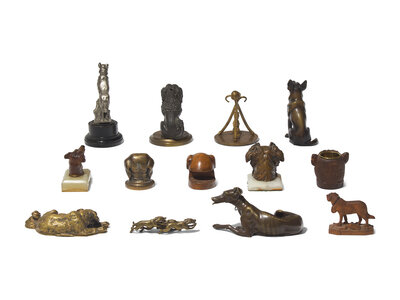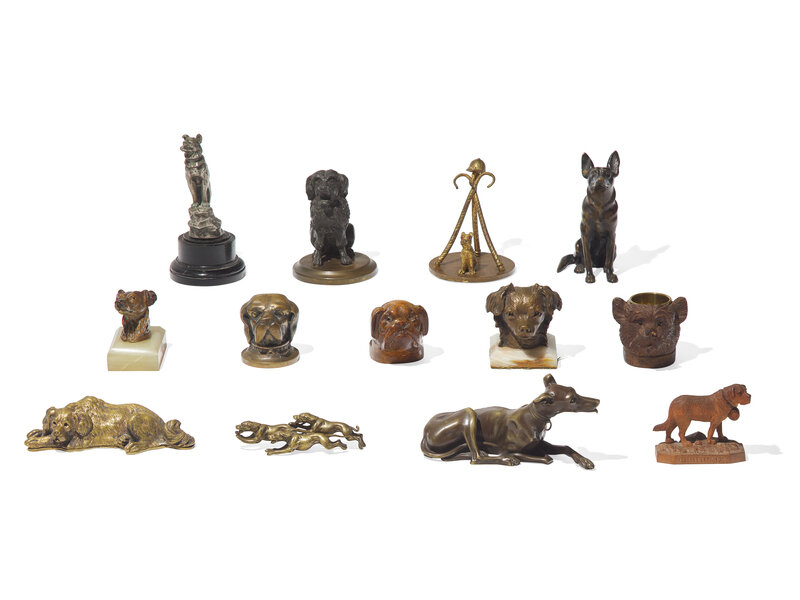 comprising a brass recumbent spaniel; a silvered metal Husky on an ebonized wood socle, signed, "E. Charles"; a patinated bronze seated German Shepherd; a patinated metal Poodle on brass socle; a brass figural group of three running hounds; a carved wood St. Bernard, inscribed, "CHAMONIX"; a bronze recumbent Whippet, and a gilt metal figure of a seated Terrier next to a coat rack, with inset glass eyes; a treen Bulldog paper holder, with inset glass eyes; a treen Terrier inkwell, with inset glass eyes; a brass St. Bernard paperweight; a bronze and onyx Papillon paperweight, signed "P.W.B."; and a painted metal and onyx Borzoi paperweight.