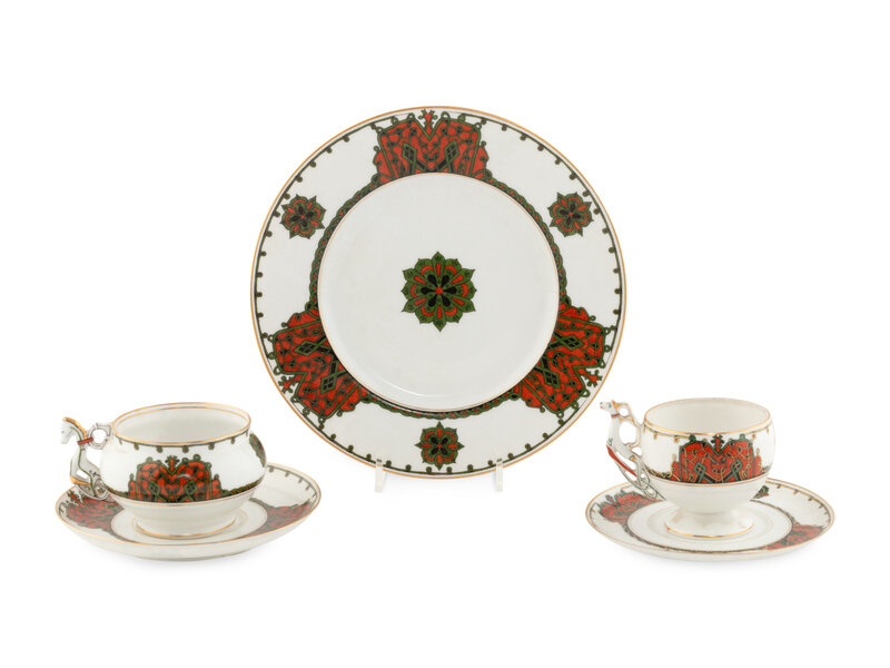 comprising a cup and saucer, a dessert plate and another cup and saucer.