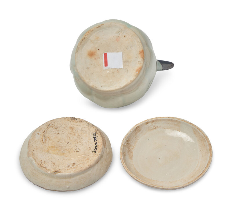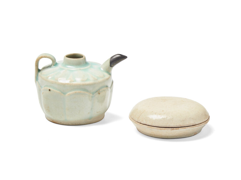 the first a Qingbai glazed small ewer, the second a molded white glazed covered cosmetic box.