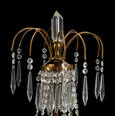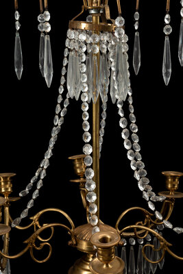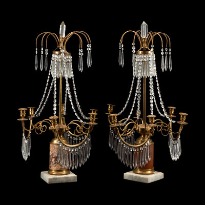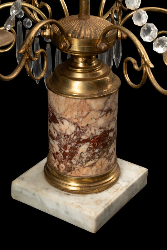A Near Pair of Baltic Style Gilt Bronze, Marble and Cut Glass Six-Light Candelabra