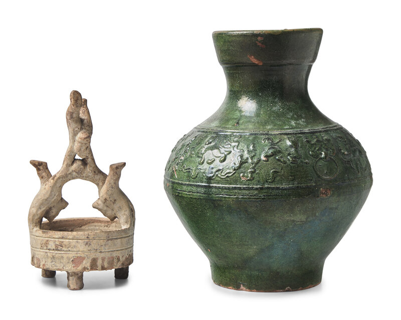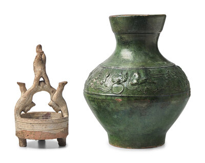 the first a green glazed hu vase with beast molded shoulder, the second a rare 'acrobat' tripod vessel.