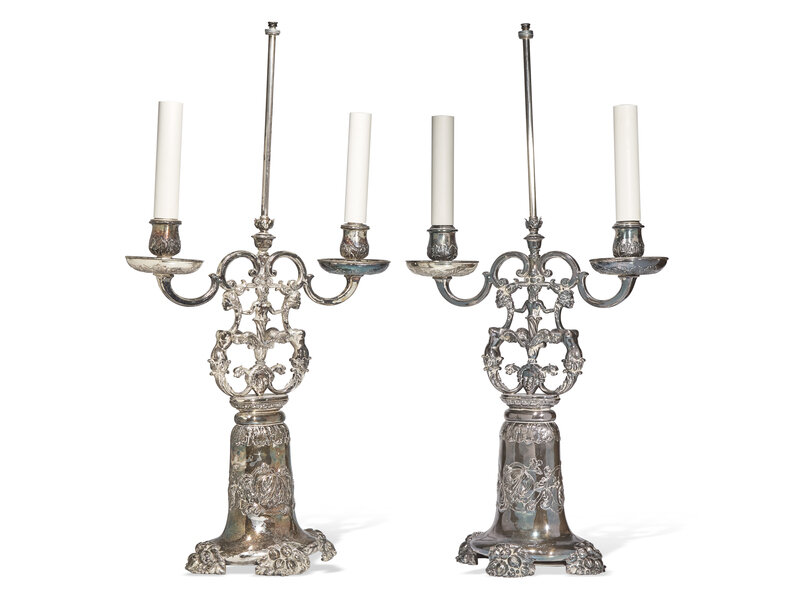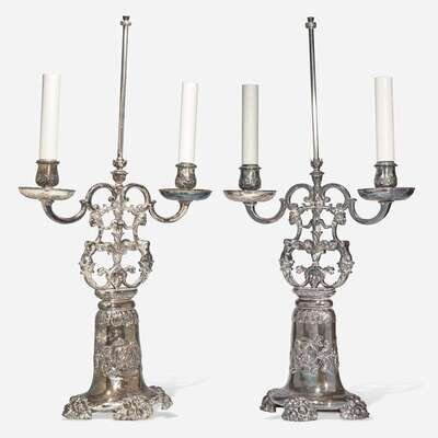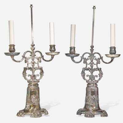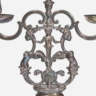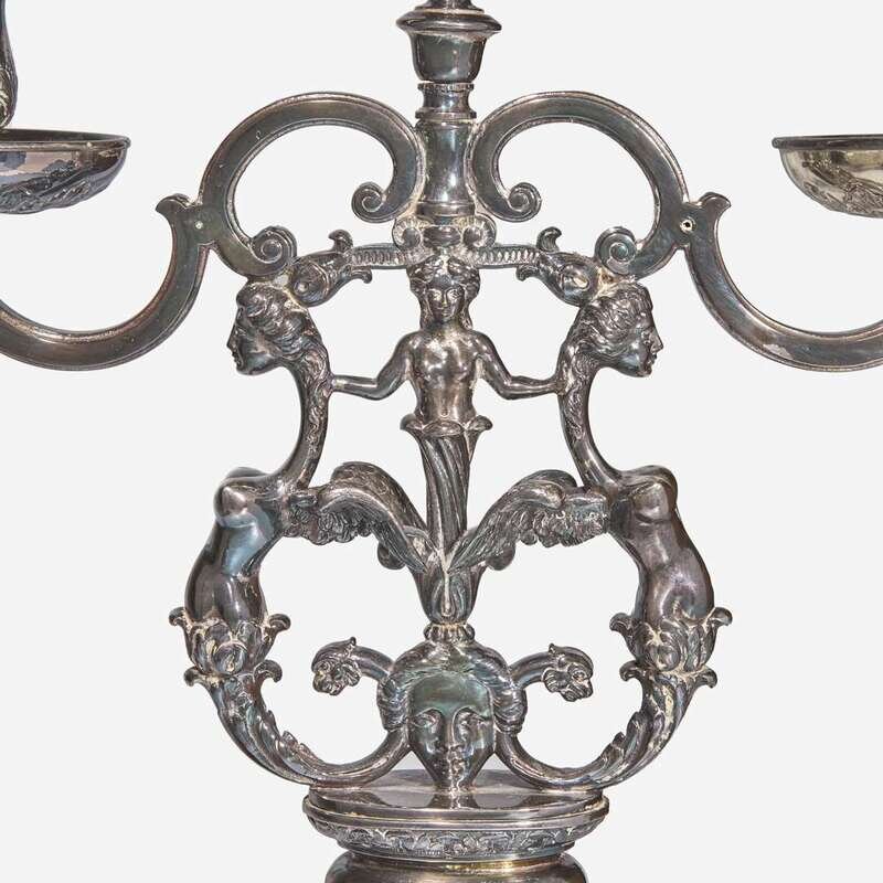 Bold bases with foliate motifs, the candle cups supported by upright depicting two harpies clasped by female figure surmounting masque, the harpy tails terminating in animal heads.