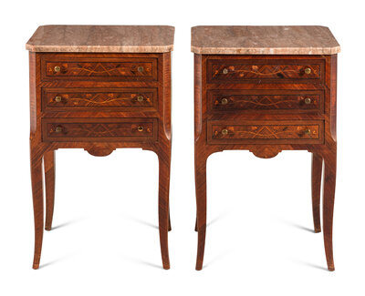 A Pair of Louis XV Style Marquetry Marble-Top Side Tables