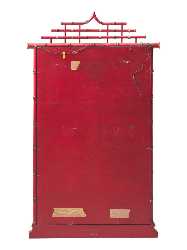 with pagoda-form top, the lower panel painted with Chinoiserie archer in a landscape., the verso bearing label for Chapman, dated "1972."