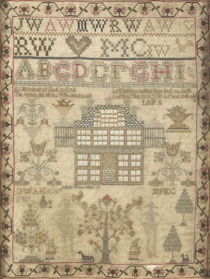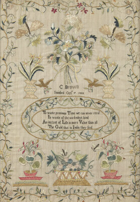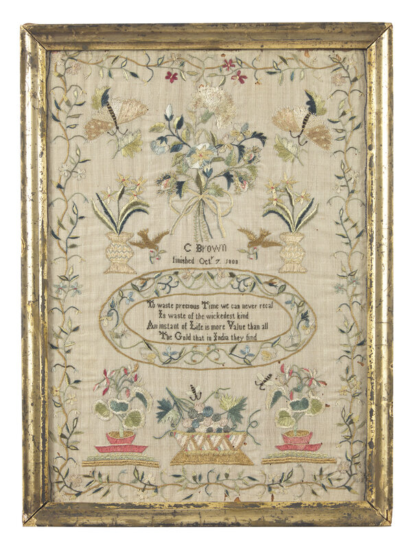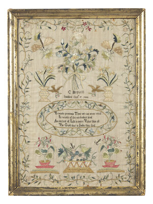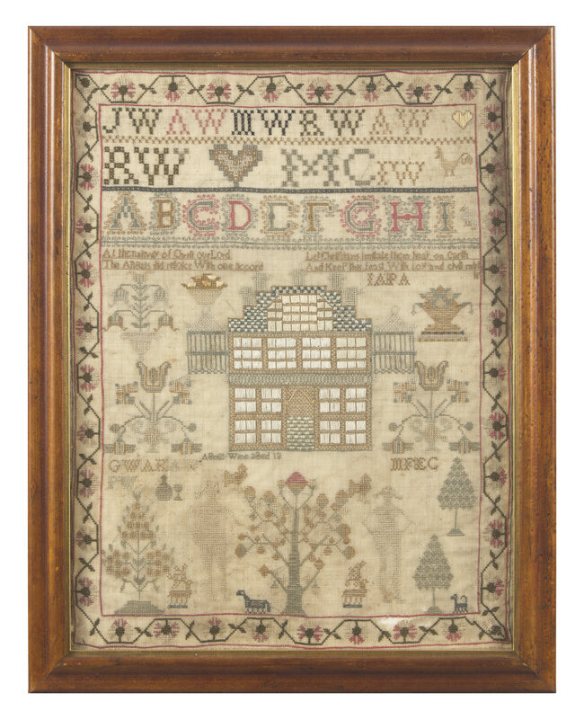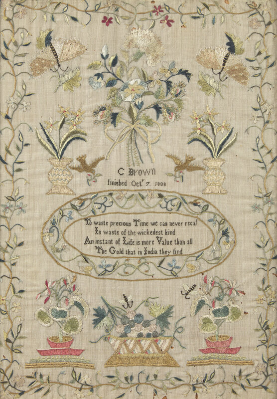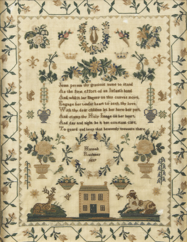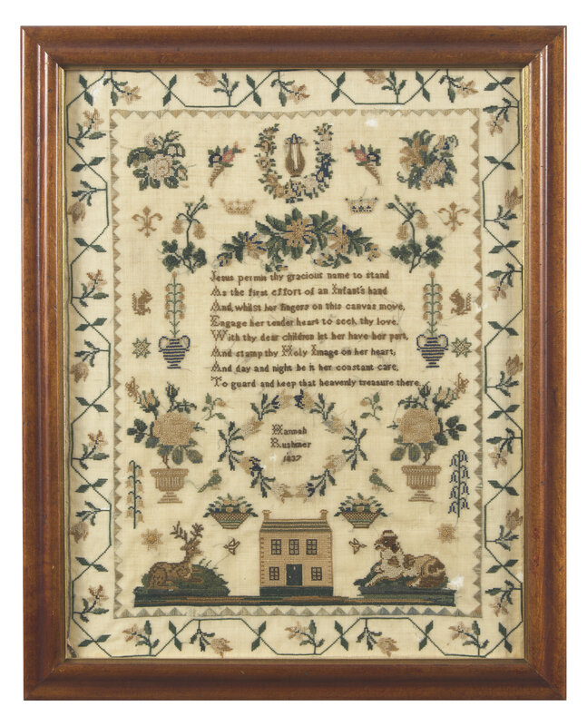 The first, worked with polychrome threads on linen ground, depicting house flanked by bird cages and floral urns, with flowering and fruiting trees, interpretation of Adam and Eve, and forest animals, and alphabet and pious verse above, variously inscribed with initials and script, "Agnes Wine Aged 13"; the second, worked with polychrome threads on cotton ground, with central pious verse, surrounded by flowering vine borders, fruit basket, floral urns, bouquet, insects, and birds, inscribed, "C. Brown Octr. 7, 1808"; and the last, worked with polychrome threads on linen ground, with pious verse surrounded by flowers, floral urns, crowns, squirrels, harp, fleur-de-lis, house, birds, and recumbent deer and dog, with meandering flowering vine border, inscribed, "Hannah Rushmer 1837"; all framed.