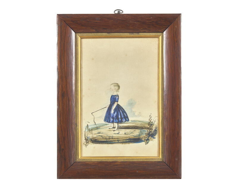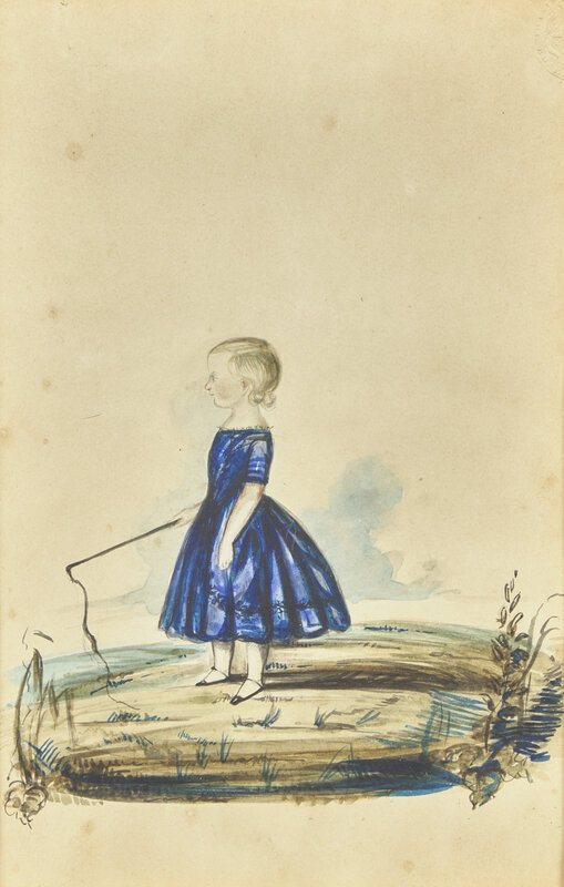 The young child shown holding whip and wearing blue dress, pencil and watercolor on paper, the paper impressed with Bristol Board stamp, u.r., framed, bearing note verso inscribed, "John Pemberton Wilson/ Born Nov. 2nd 1846/ Died Feb. 15th 1880/ Son of John and Hannah Wilson of Winewall, Colne, Lancashire./ Interred at Winewall Inghamite Chapelyard/ The above John Wilson."
