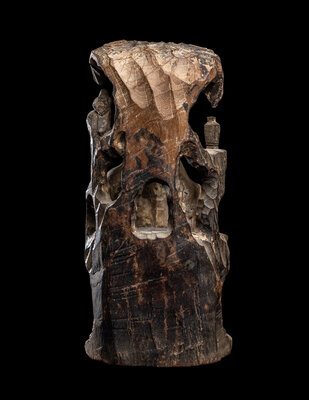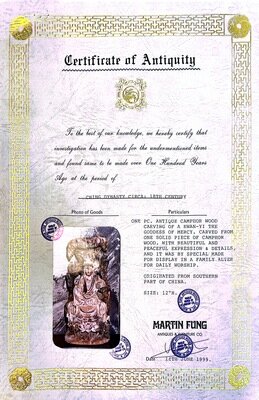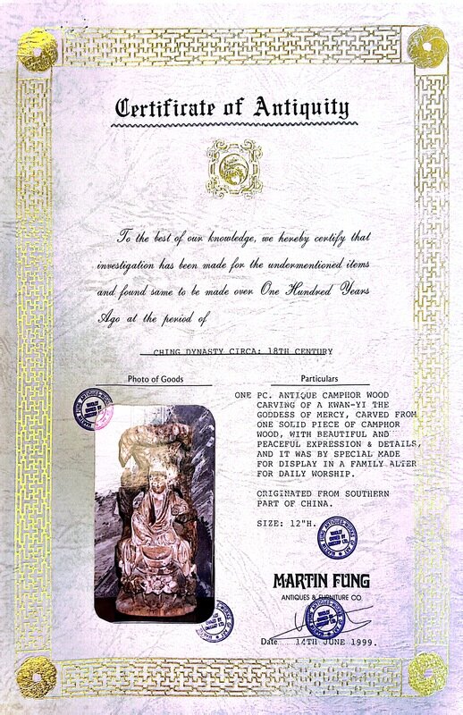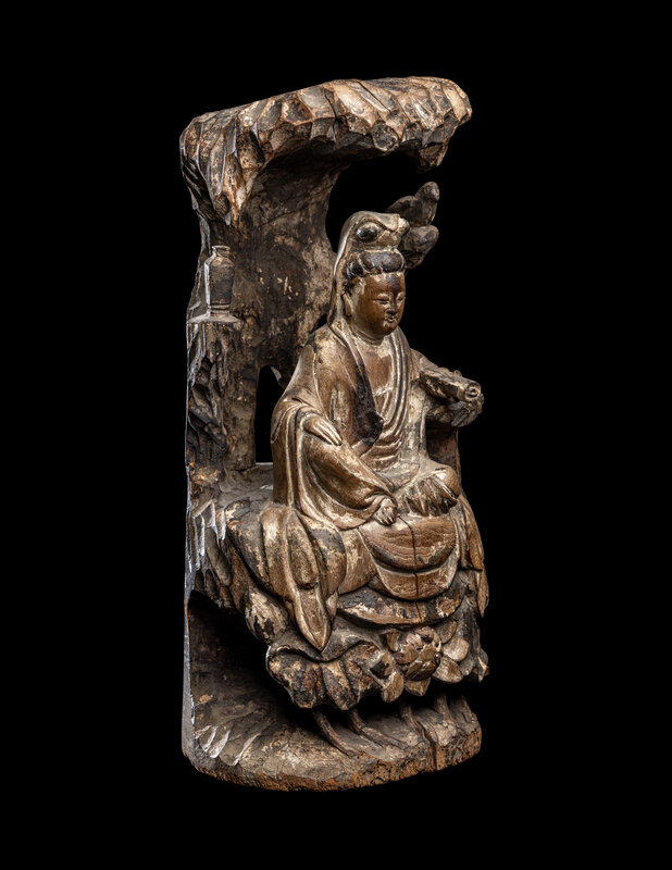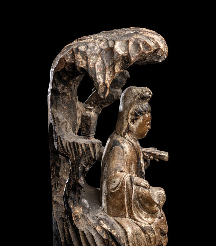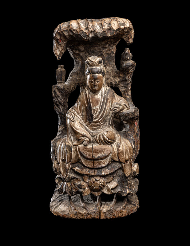 the deity depicted seated at ease on a raised pedestal backed by a tree, flanked by a vase and a bird, her left hand bearing a scroll and her face carved with a benevolent expression.