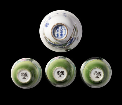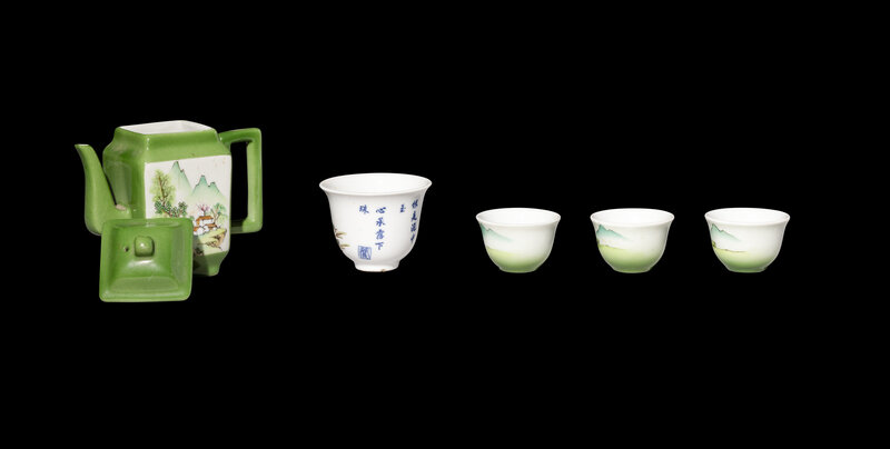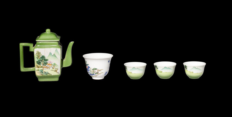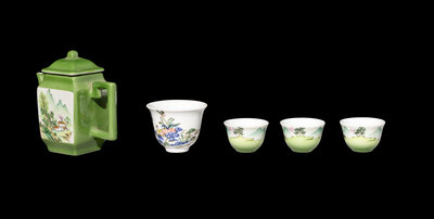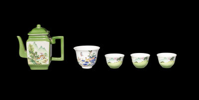 A Five-Piece Chinese Green Ground Famille Rose Porcelain Tea Set