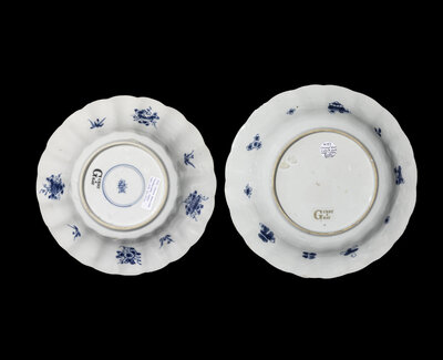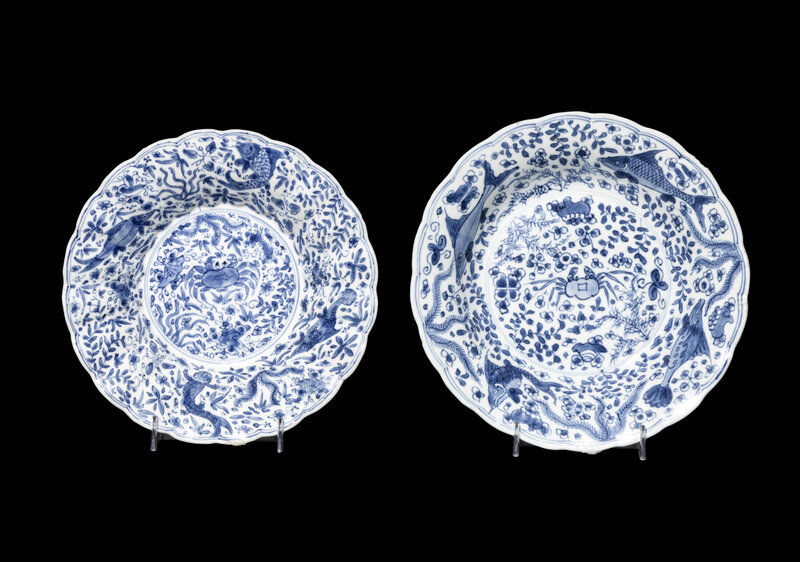 each of lobed form, painted in rich cobalt-blue with fishes, crabs, and other sea creatures.