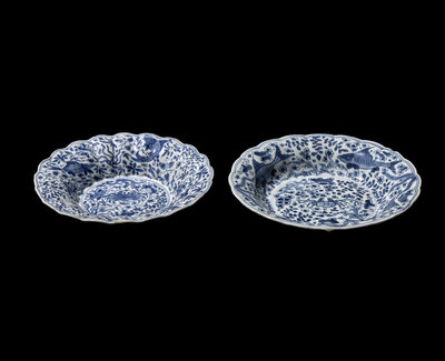 清康熙 青花魚藻圖花口賞盤兩件