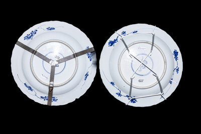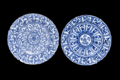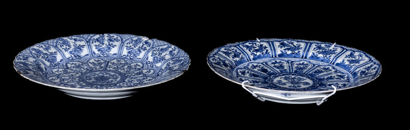 清康熙 外銷青花孔雀式花卉紋花口賞盤兩件