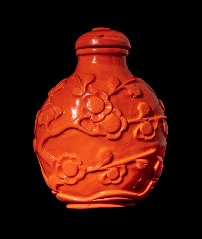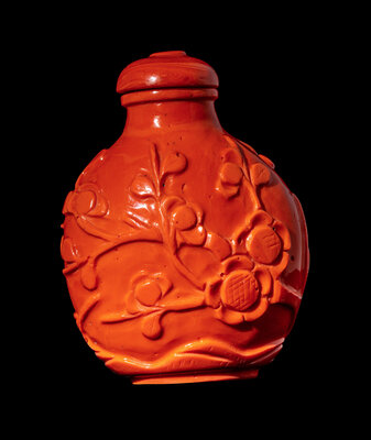 A Chinese Glass Imitating Red Coral 'Prunus' Snuff Bottle