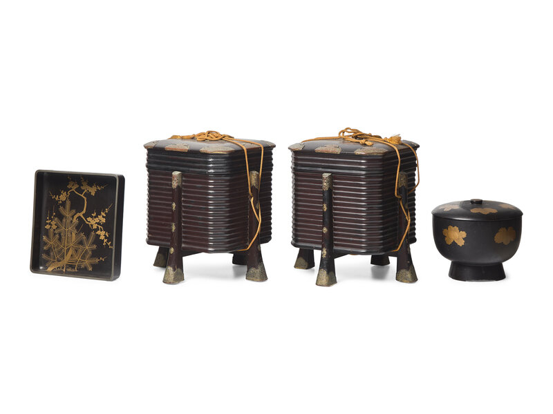 comprising a pair of square storage chests, a large covered bowl and a rectangular tray.