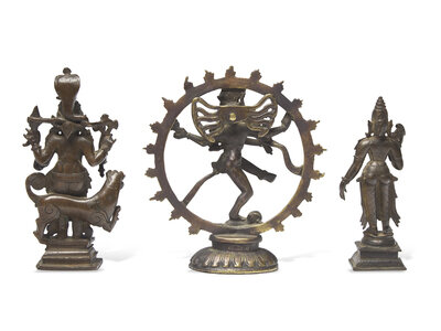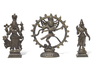 comprising a figure of Parvati with parrot, a figure of Mahishasura Mardini with lion, and a figure of Shiva Nataraja.