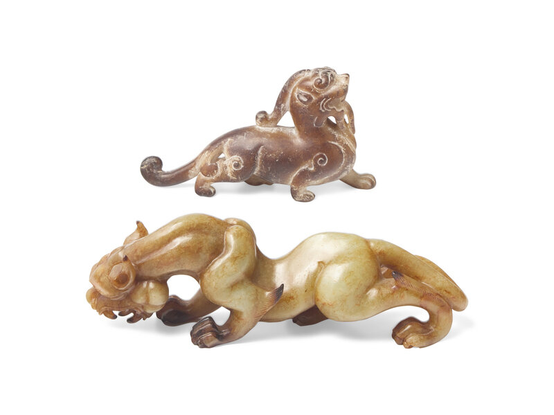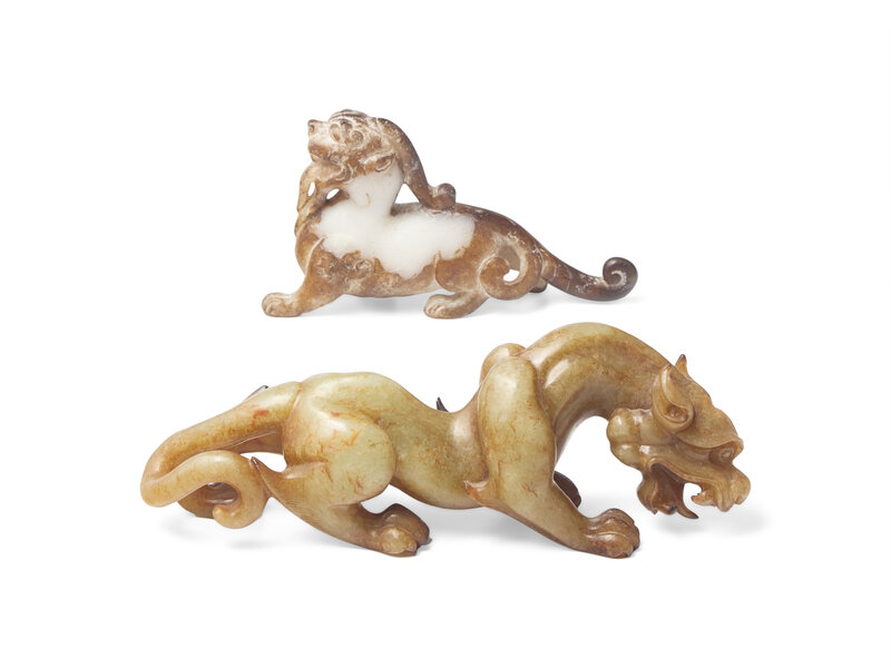 A Chinese Two-Tone Stone Bixie and a Yellowish-Beige Jade Mythical Beast