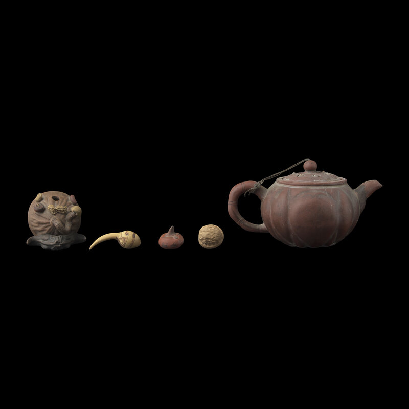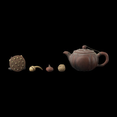 comprising a lotiform teapot, the cover in the form of a pod with six moveable seeds, the underside of the cover with two impressed marks; a lotus pod and nuts-form water dropper, the pod with moveable seeds, the exterior with various applied nuts and a caltrop, base with two impressed marks; a water chestnut; a walnut; an arrowroot shoot (last three unmarked).