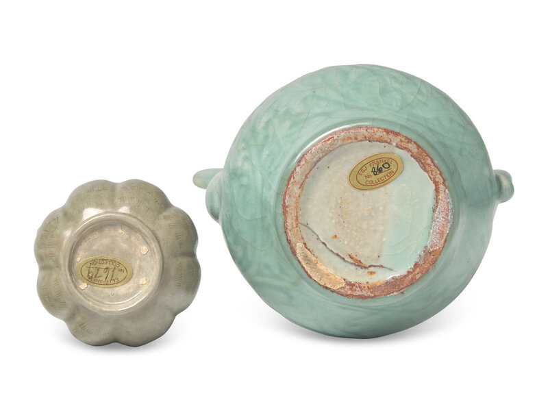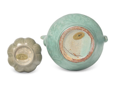the first with lobed body, the second carved with lotus scrolls.
