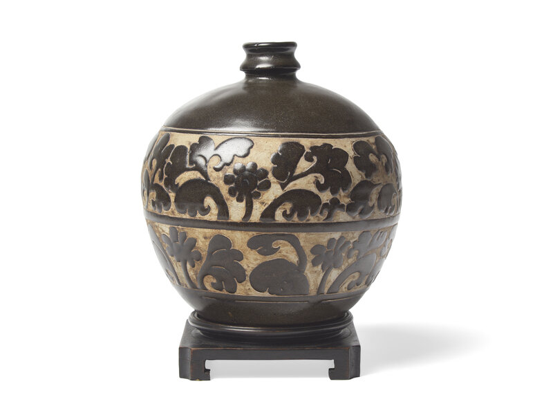 scrolls and flowers carved through the thick dark brown glaze; circular wood stand.