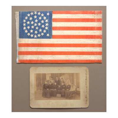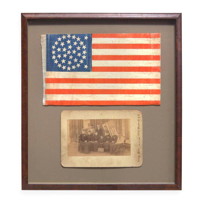 Printed on glazed linen, the stars arranged in an off-balance triple medallion configuration, mounted and framed together with a rare cabinet photograph showing a larger flag with the same star configuration. Inscribed on verso "Old School House on Black Mt., Sonoma Co," with photographer's imprint, "W.N. Collom / 2532 Mission Street, San Francisco." 8 1/2 in. x 14 in. (sight).