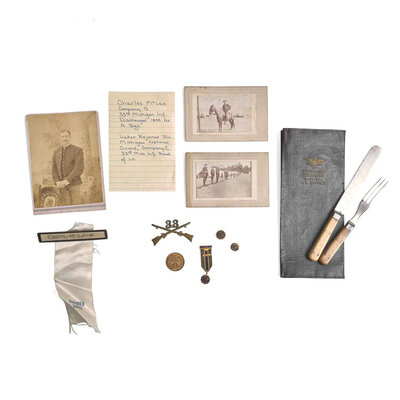The flag belonged to Charles McLean (1875-1951) and is accompanied by a pressed brass insignia of the 33rd Michigan Infantry, three photographs ca 1898: the first of McLean in uniform, another of McLean on horseback, and the third of a military encampment; together with a camp knife and fork, and four American Legion pins.