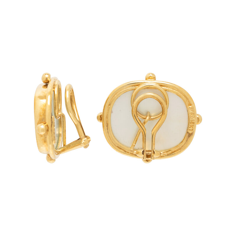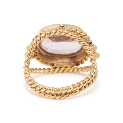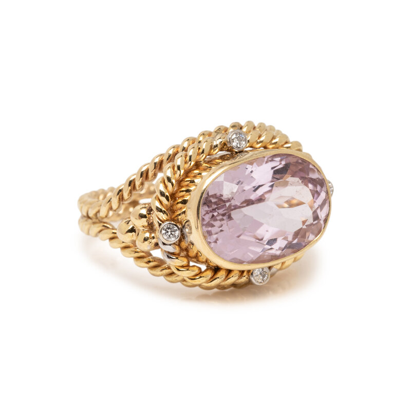 Including a ring set with an oval faceted kunzite measuring approximately 13.75 x 9.75 x 7.35 mm and round brilliant cut diamonds, and a pair of clip earrings set with glass intaglios backed by mother-of-pearl. 14 karat and 18 karat yellow gold. Ring size: 7 1/2. Earrings: 3/4 x 7/8 inch.