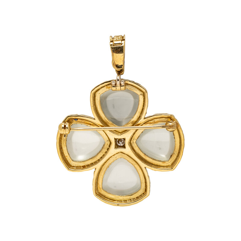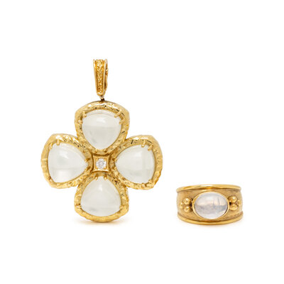 Including a ring set with an oval cabochon moonstone measuring approximately 9.50 x 7.60 x 4.95 mm, and a brooch/pendant set with four pear cabochon moonstones measuring approximately 12.15 x 12.15 x 8.00 mm and one round brilliant cut diamond. Yellow gold. Ring size: 6 1/2. Pendant: 1 7/8 x 1 3/8 inches.